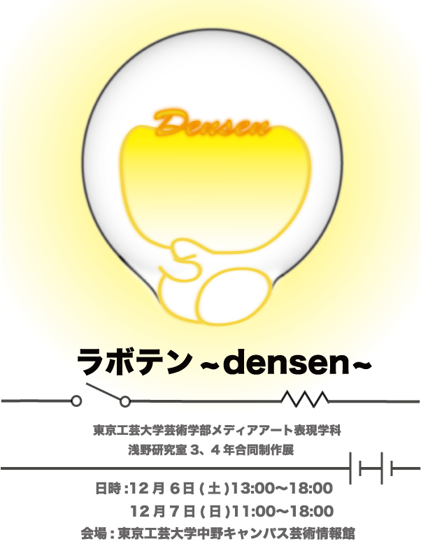 「ラボテン-densen-」は東京工芸大学メディアアート表現学科浅野研究室の生徒による作品展です。 今回のラボテンのテーマ-densen-には、電線を使った作品からみなさんへ楽しさが伝染していって欲しいという想いを込めています。 私たちからみなさんに楽しさが-densen-する空間へ、是非お越し下さい! |